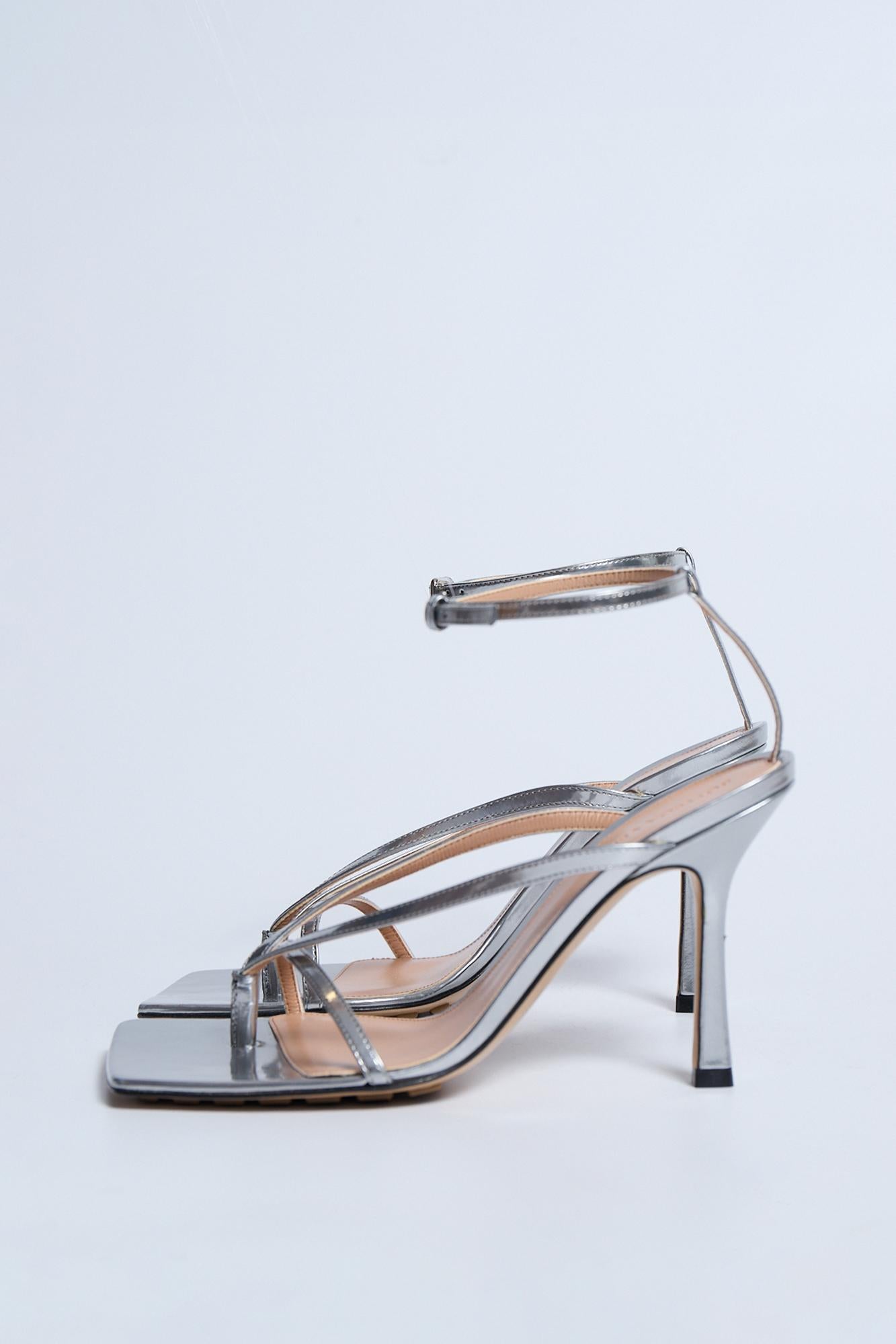 Босоніжки з металізованої шкіри Bottega Veneta. Внутрішня устілка шкіра, підошва шкіра та каучук. Довжина устілки 25см, модель маломірить на 0.5-1 розмір. Висота підборів 10см. Виробництво Італія