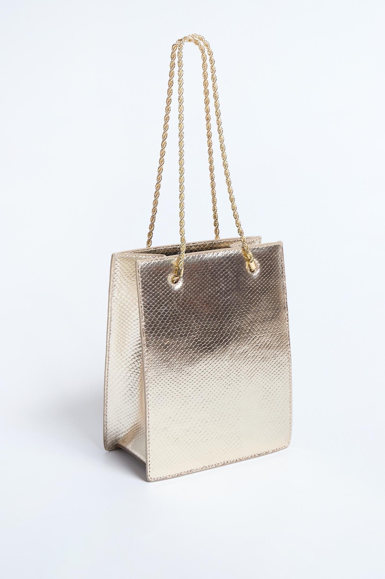 Сумочка з тисненої золотої шкіри Loeffler Randall. Розміри 18*23*9см, металеві ручки-ланцюжки, всередині один відділ і боковий карман