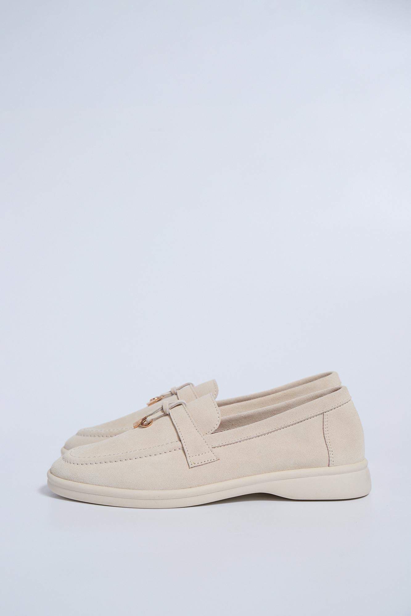 Замшеві класичні лофери з витонченою золотою фурнітурою від Os de coure у молочному кольорі. Модель без підкладу, внутрішнє оздоблення шкіра.